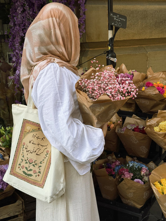 Celebrate what’s truly yours with our "Tu Jhoom" tote. Adorned with Mughal-inspired motifs and the uplifting lyric “jo hai tera lab jayega kar k koi bahana,” this ethically crafted, durable tote is perfect for daily adventures—with a touch of poetic charm and sustainability.