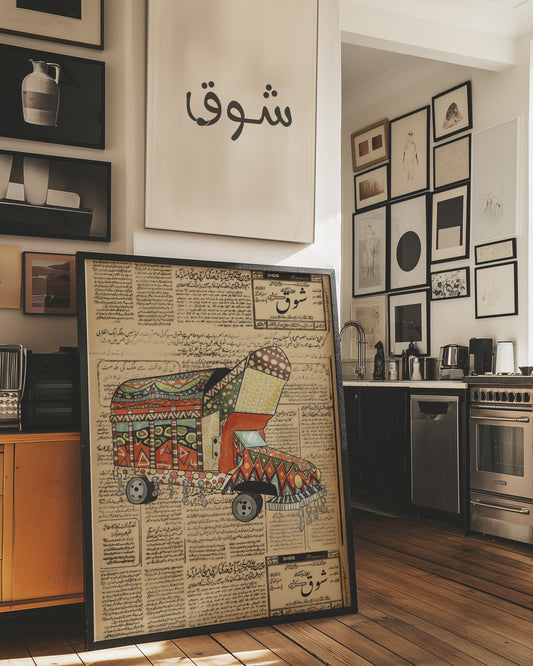 Vintage Rickshaw Art Print with Urdu Newspaper Background