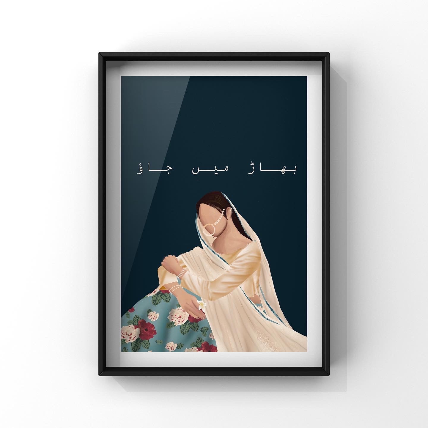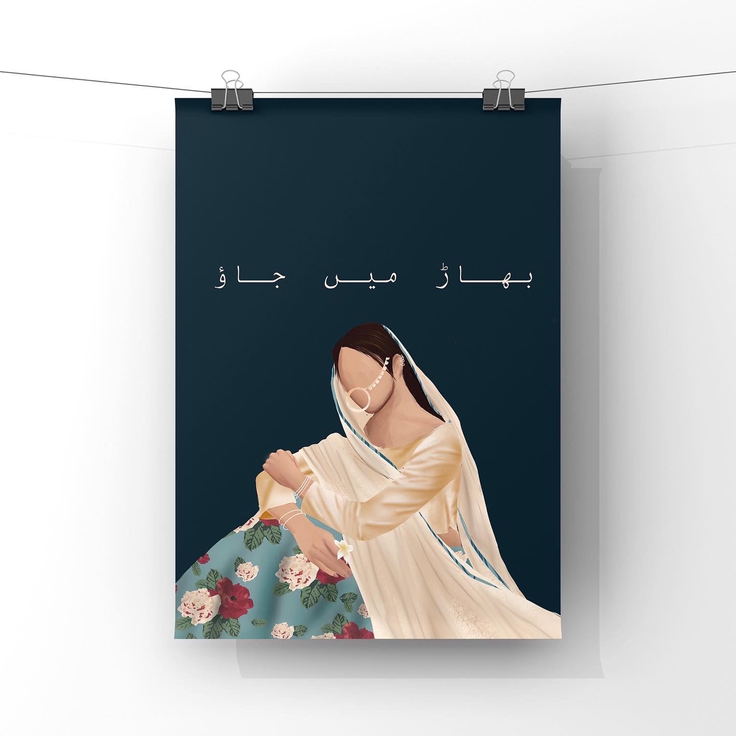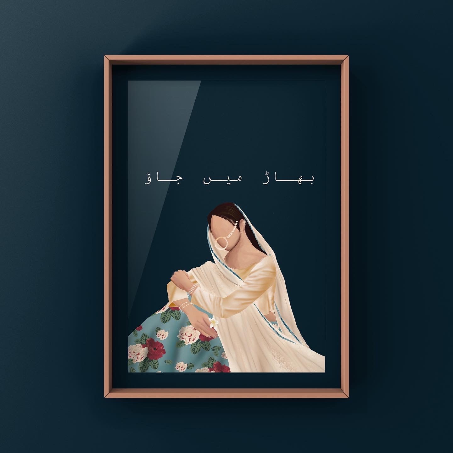 This art print captures the bold, unapologetic spirit of a desi woman dressed in a traditional lehenga, exuding confidence and attitude. The phrase “Bhar Main Jao” adds a playful, rebellious touch—an ode to self-assurance and unapologetic individuality. With rich colors and intricate details, this piece blends tradition with modern expression, making it a striking addition to any space.