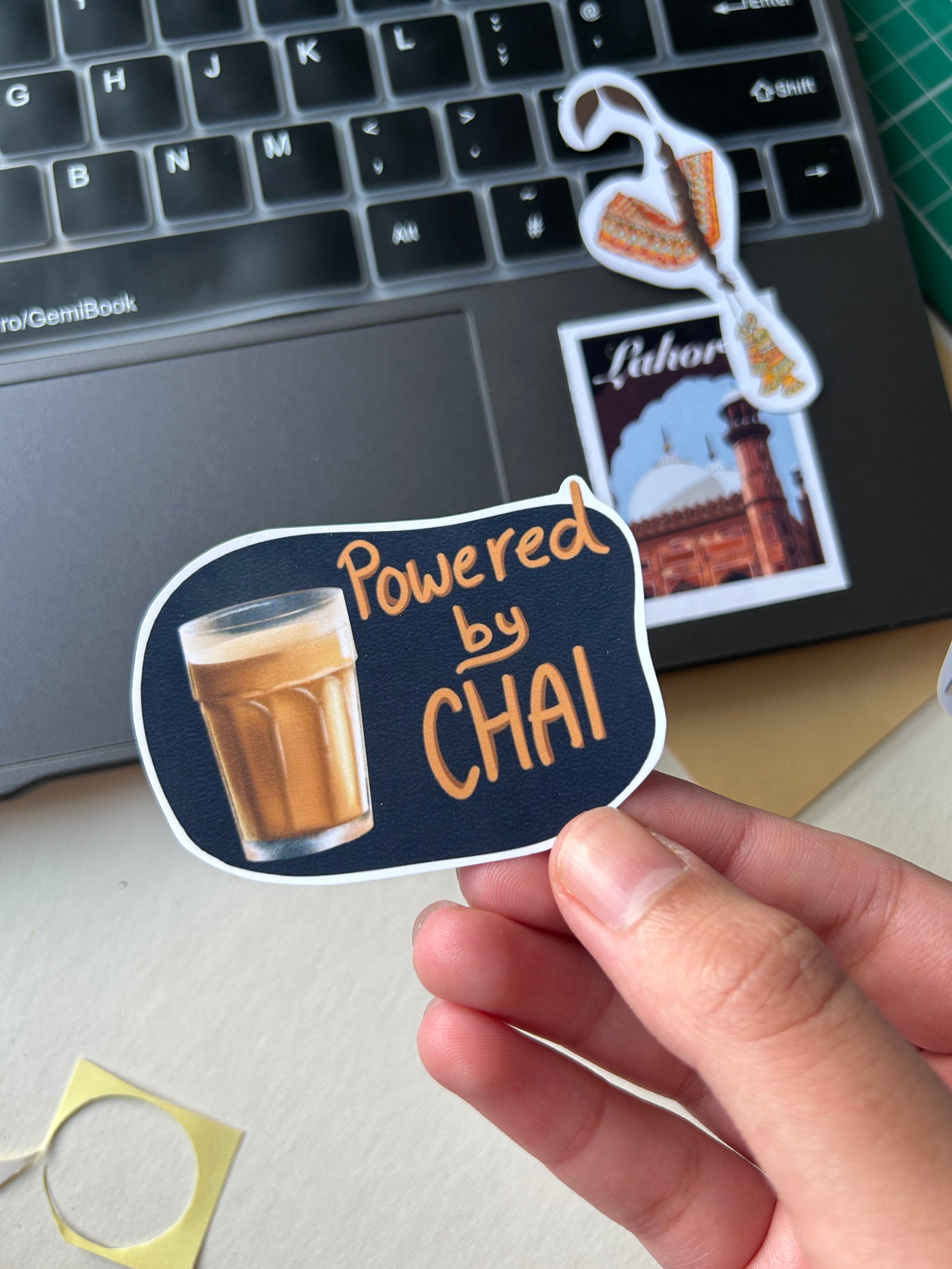 Fuel your day with the energy of cutting chai! This playful "Powered by Chai" sticker features an illustration of a classic cup of cutting chai, a beloved staple in South Asian culture. Perfect for chai lovers who can’t start their day without a warm cup of tea, this sticker adds a touch of fun and flavor to your personal items.