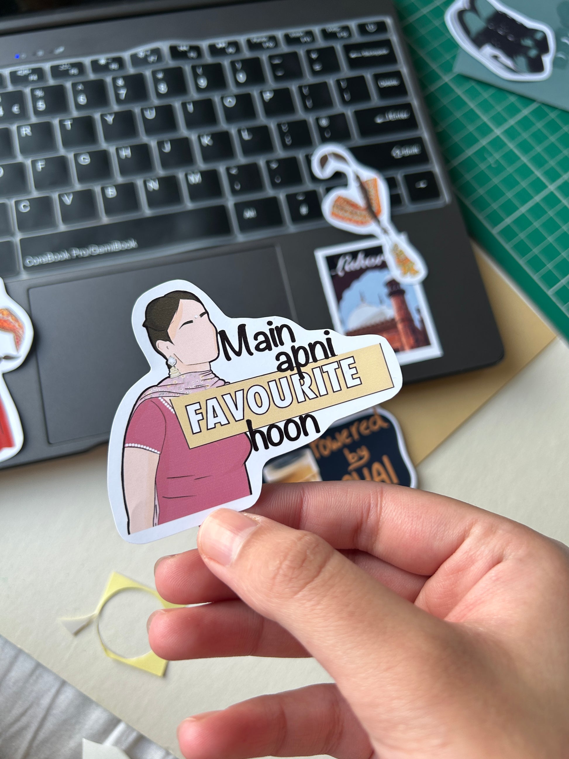 Celebrate self-love and confidence with this playful "Main Apni Favourite Hoon" sticker, which translates to "I am my own favorite." Inspired by the empowering spirit of self-appreciation, this high-quality matte sticker is perfect for adding a touch of personality and positivity to your belongings.
