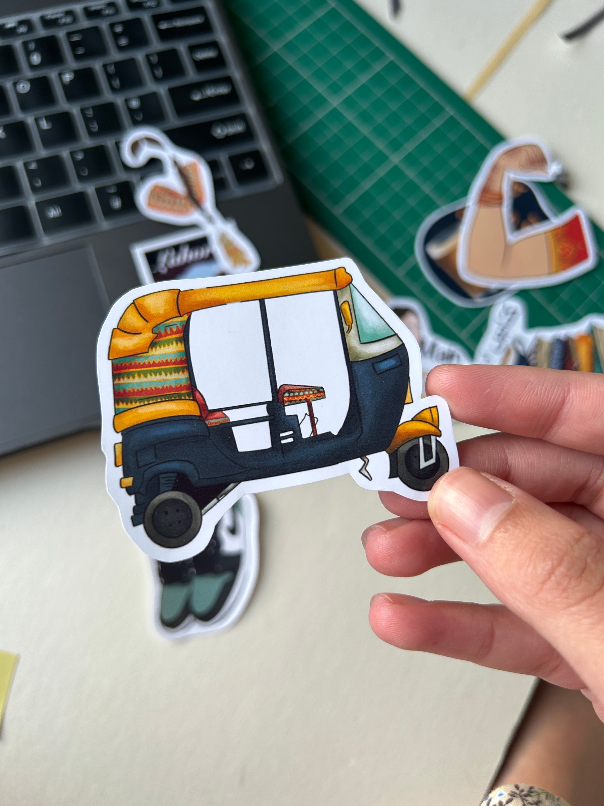 Bring the vibrant spirit of South Asian streets to your belongings with this Classic Rickshaw Sticker. Featuring the iconic design of a traditional rickshaw, known for its bold colors and intricate details, this sticker captures the essence of South Asian culture in a fun, artistic way.