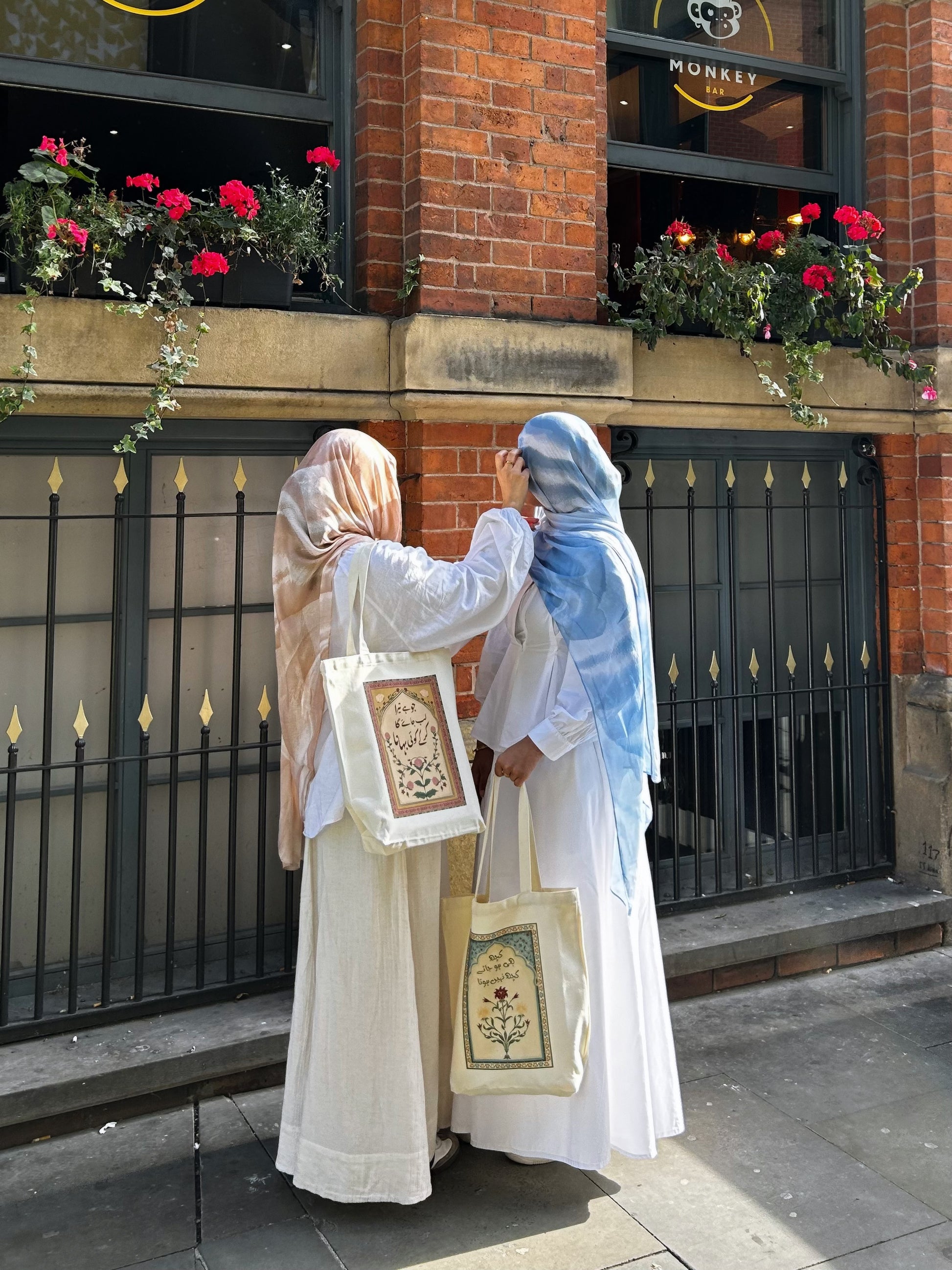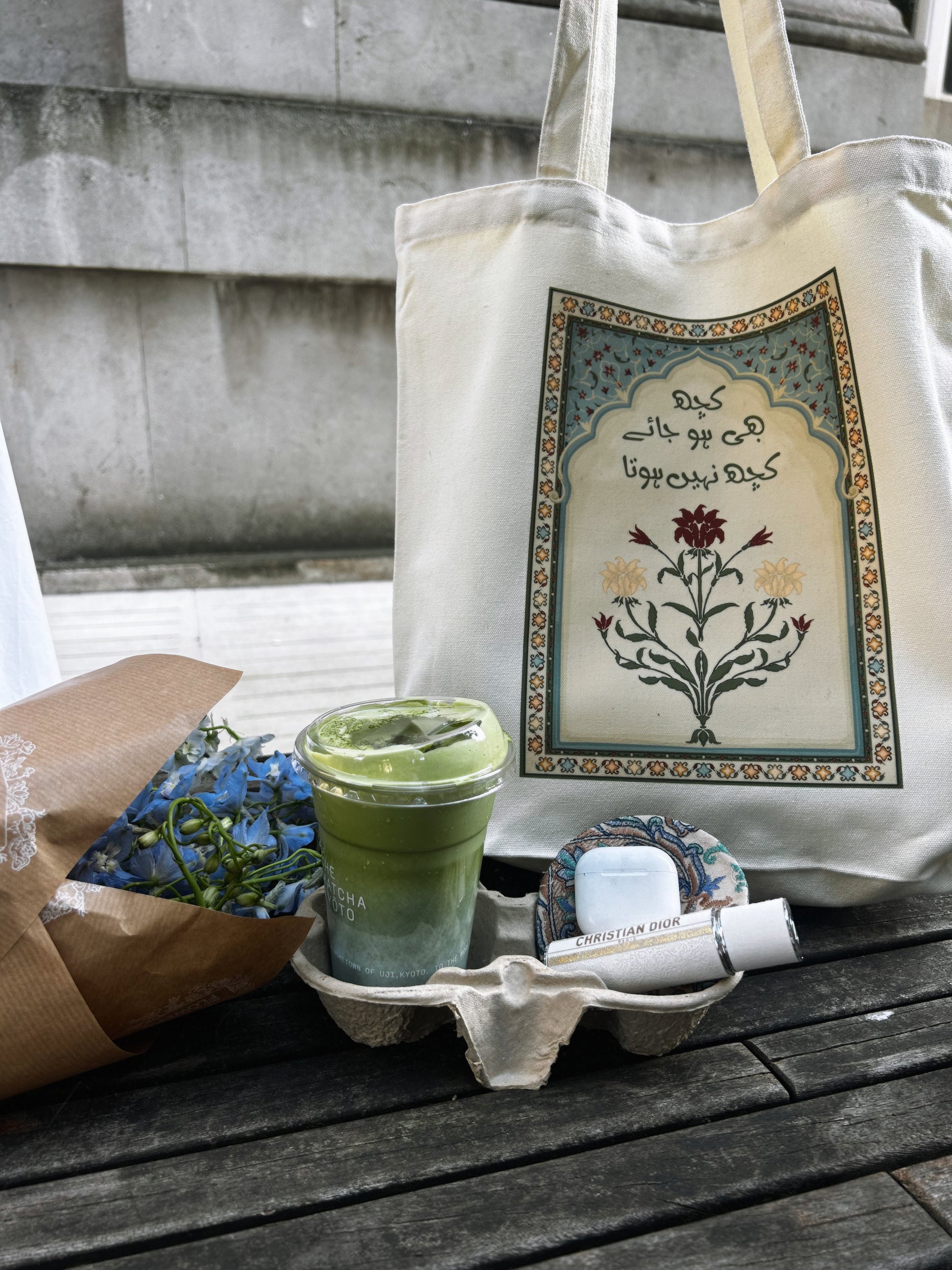Inspired by the elegance of Mughal art and the poetic rhythm of Urdu, both totes are ethically crafted from sturdy cotton with reinforced cross-stitched handles. Whether you carry it to your morning chai run or a long day on campus, each bag tells a story of strength, grace, and a love for all things desi.