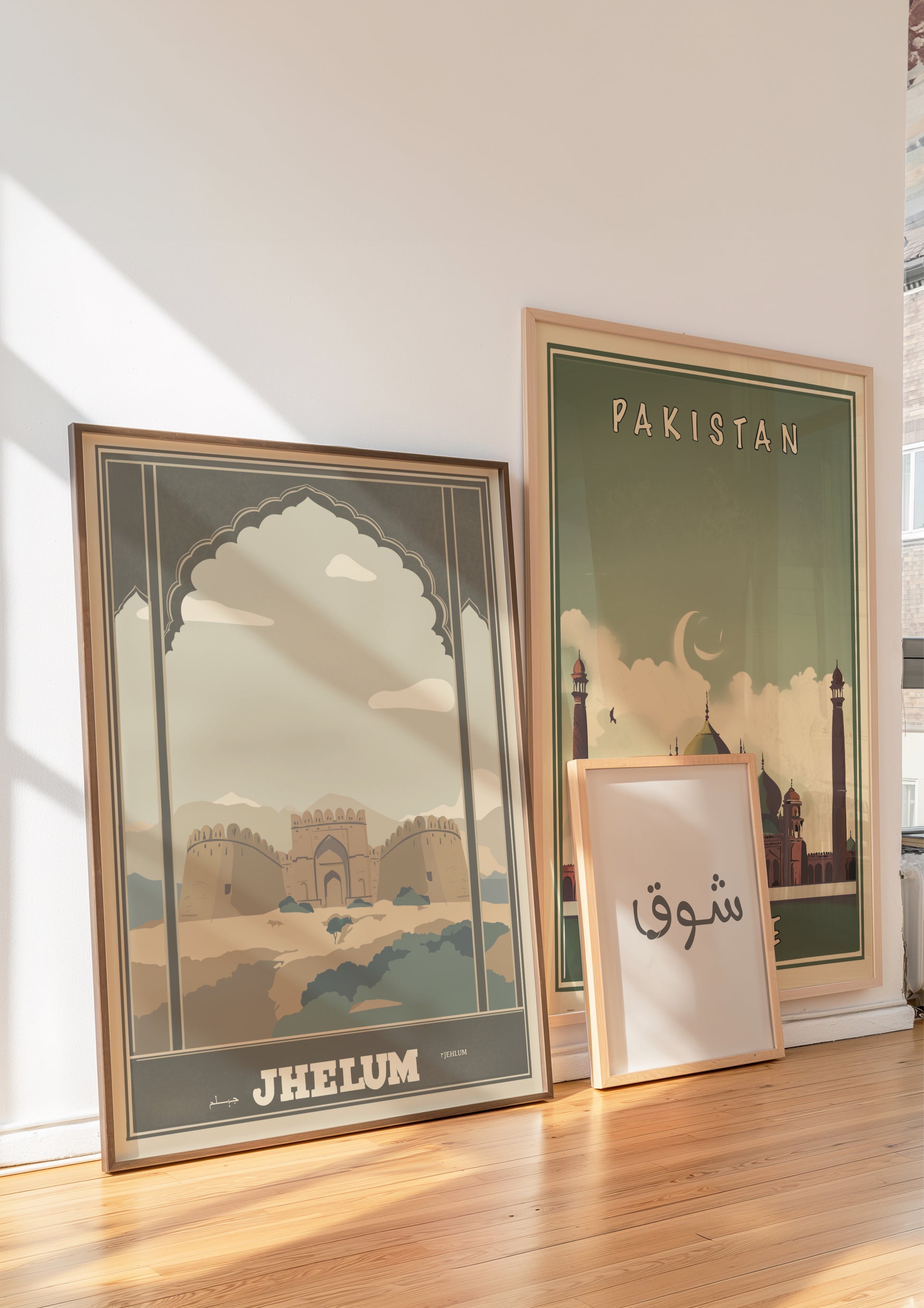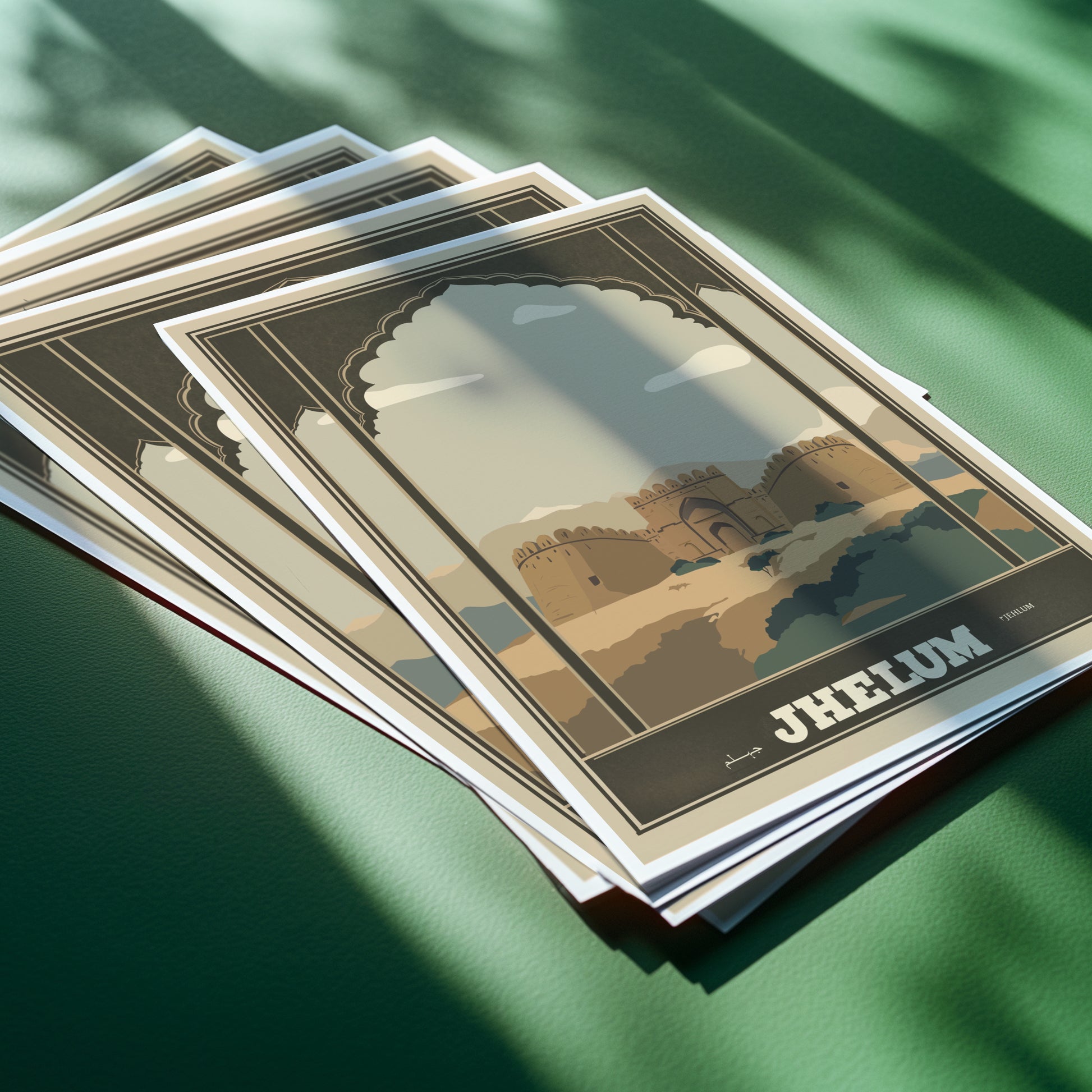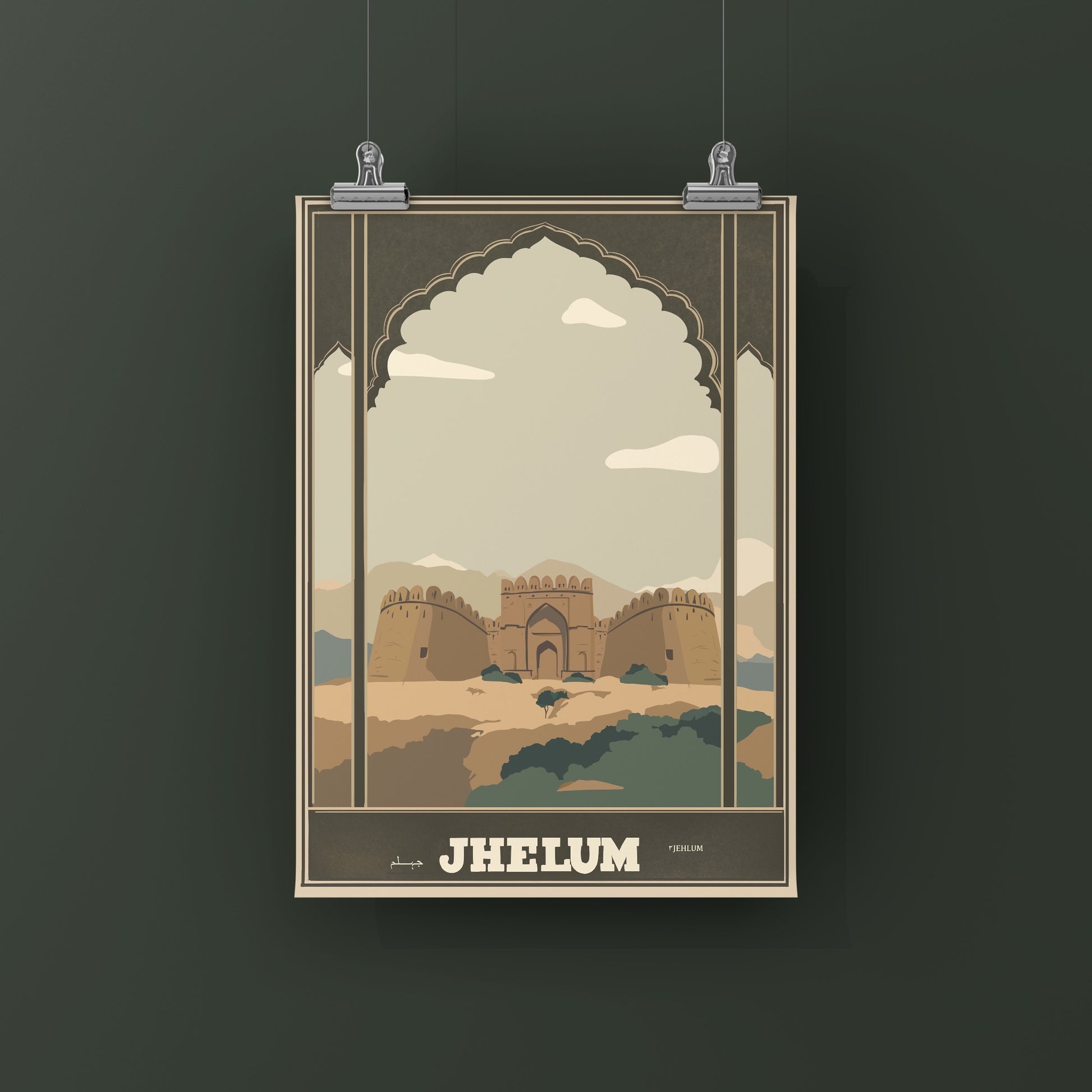 This vintage-inspired travel poster showcases the essence of Jhelum, with the historic Rohtas Fort as its centerpiece. The print captures the timeless beauty of Jhelum’s landscape and the imposing fort, blending historical significance with artistic design. With its muted tones and classic aesthetic, this piece evokes a sense of nostalgia for the rich heritage and scenic charm of Jhelum, making it a perfect homage to both the city and its iconic fort.