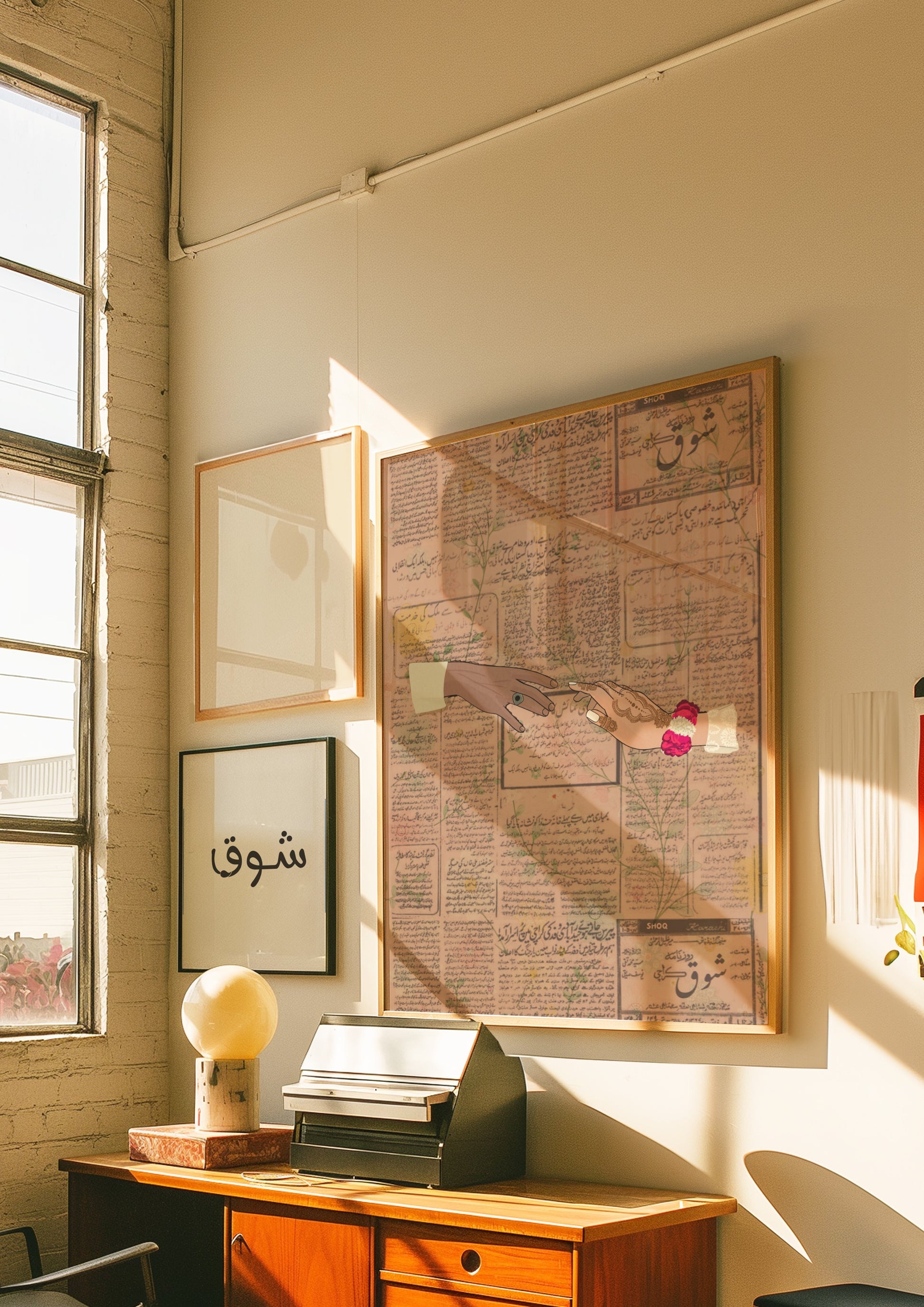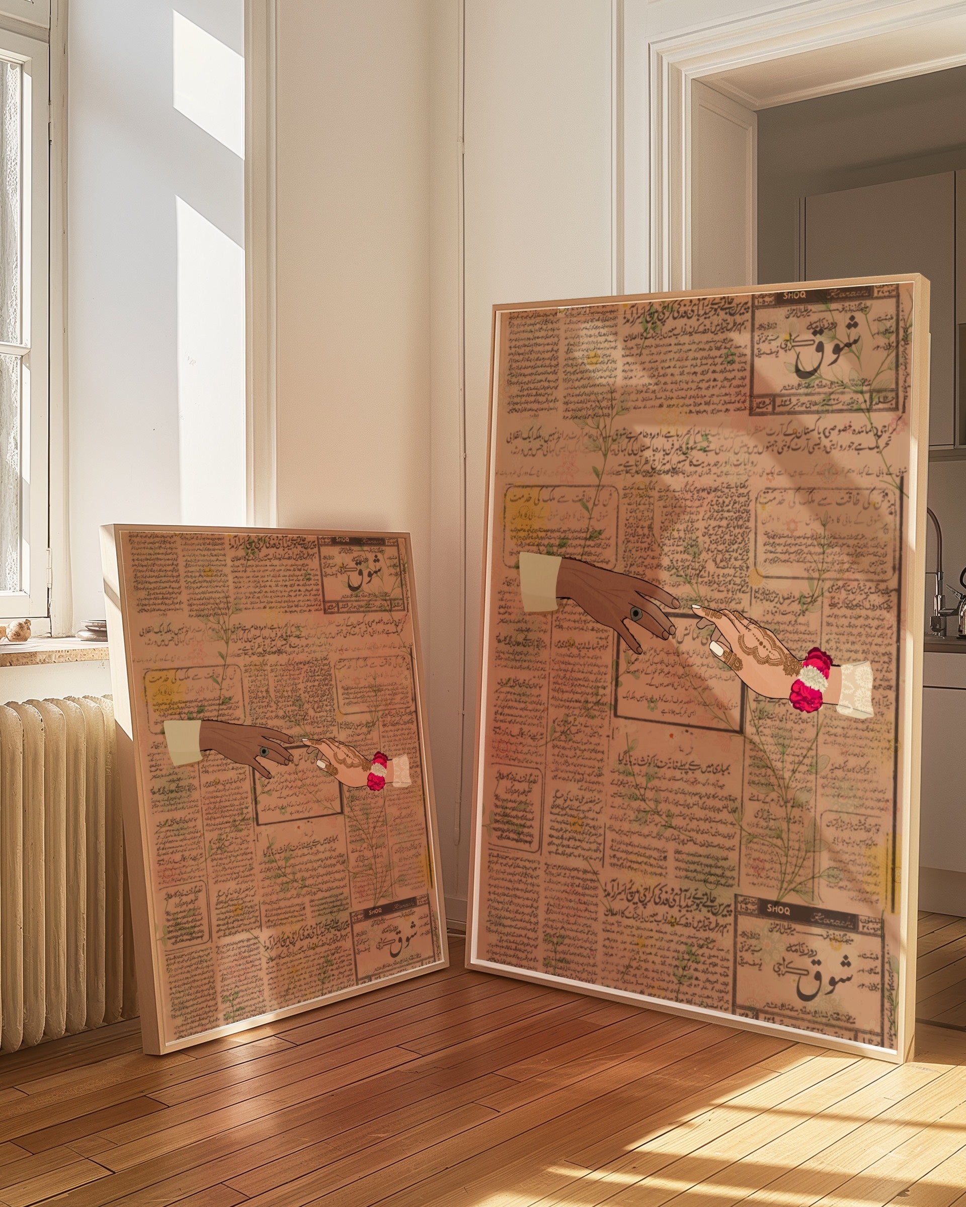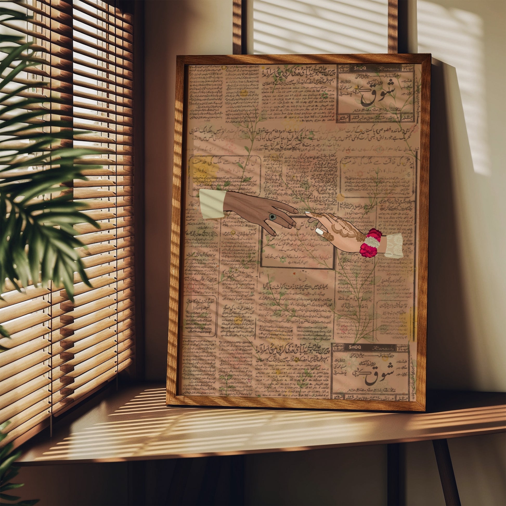 Celebrate your love with this beautifully unique art print, featuring two hands pointing towards each other in a tender gesture of connection. The woman's hand is adorned with gajras, a traditional flower bracelet worn in South Asian weddings, while both hands are dressed in vibrant, colorful traditional desi clothing, adding cultural richness and warmth to this intimate depiction of love.