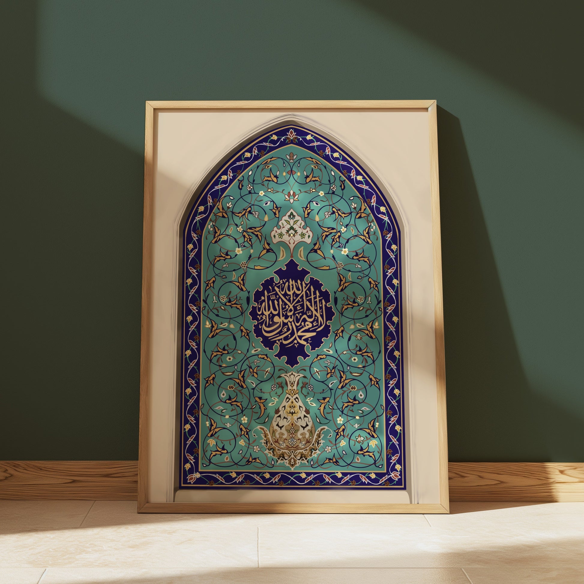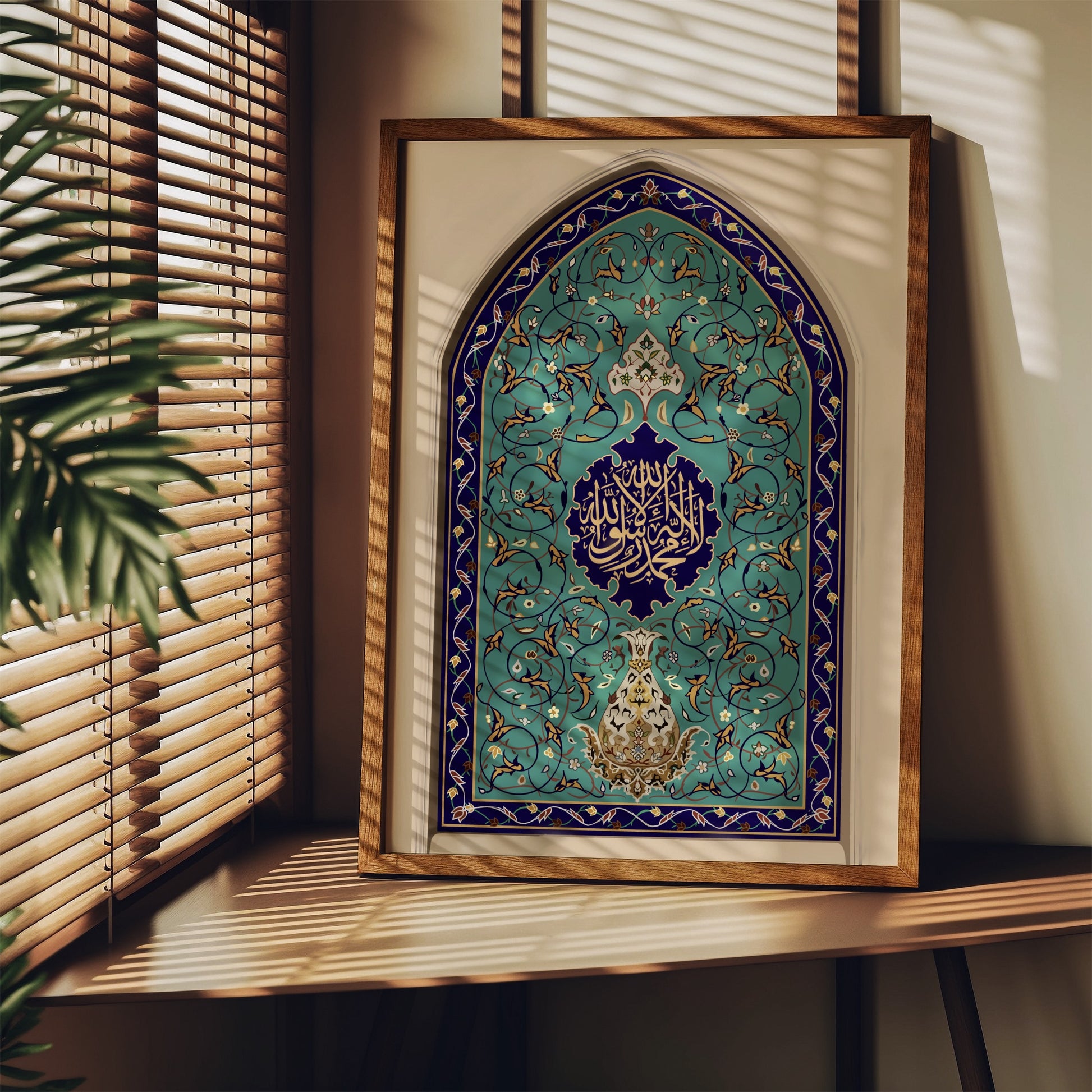 Elevate your space with this striking Islamic calligraphy art print, featuring the timeless words "La ilaha illallah" (There is no god but Allah) in bold, elegant script. Designed to echo the architecture and ceramic tilework of South Asian mosques, this piece draws inspiration from the rich color palettes and arabesque motifs found in historic Mughal design—especially the arches and floral vines that adorned places of worship.
