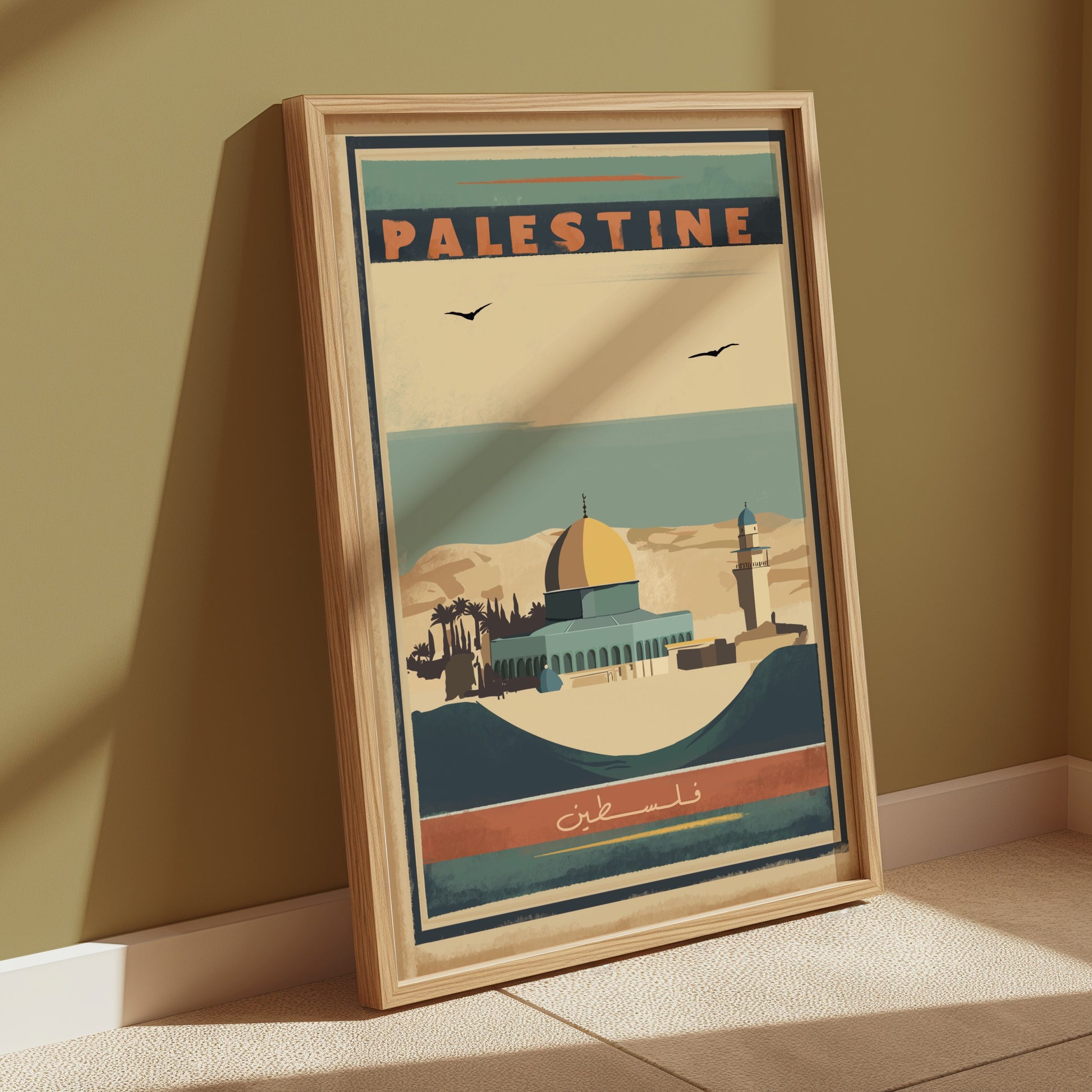 This vintage-inspired travel poster features the Dome of the Rock, a timeless symbol of Palestinian heritage, in stunning detail. The design channels the golden age of travel posters with a nostalgic, retro aesthetic, while carrying a powerful message of support and solidarity. The rich colors and classic composition honor the beauty of the landmark and its significance as a cultural and religious symbol.