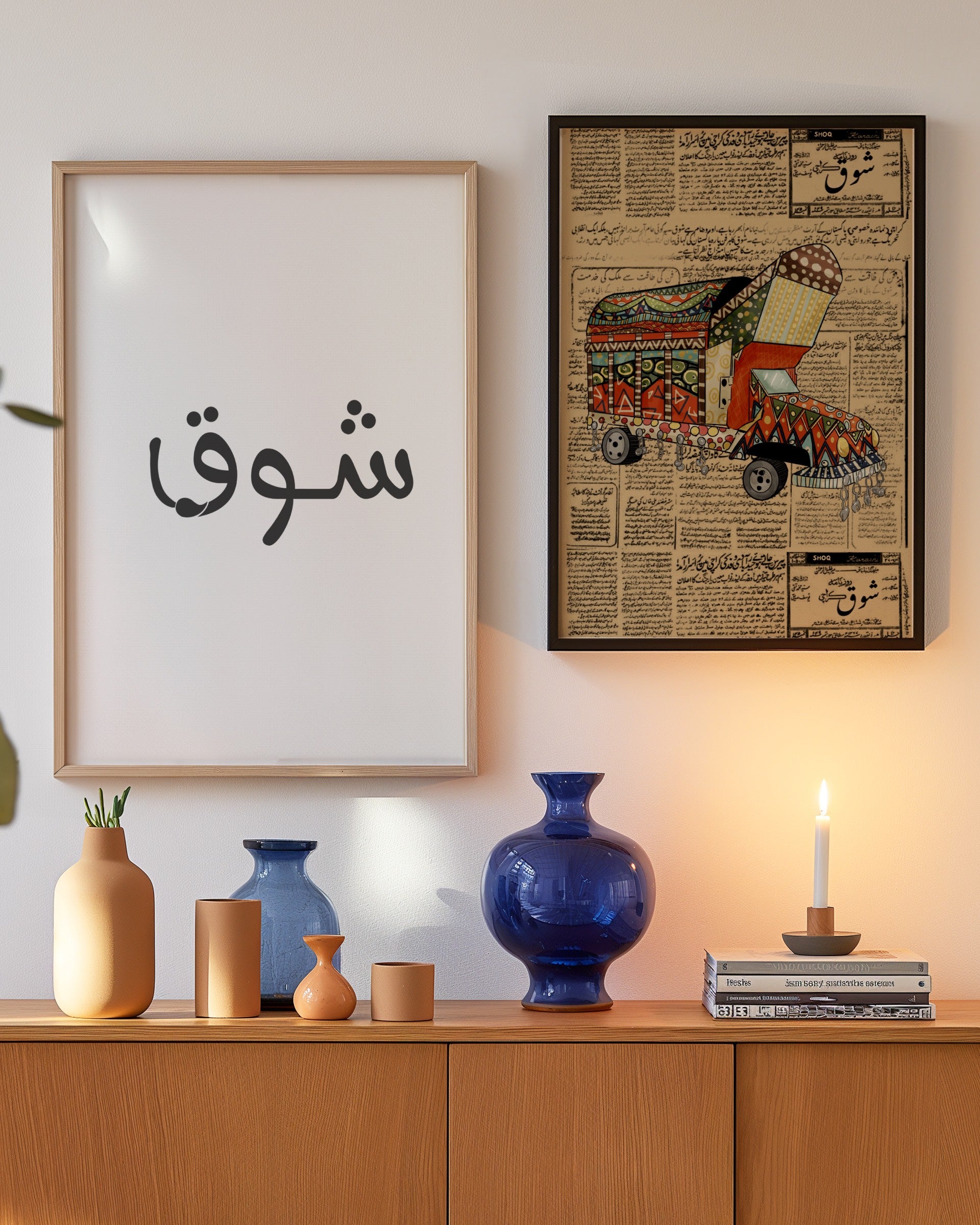 This print is a tribute to that tradition, combining the vivid energy of truck art with the cultural depth of the Urdu language, creating a timeless piece that brings the spirit of the roads into your space.