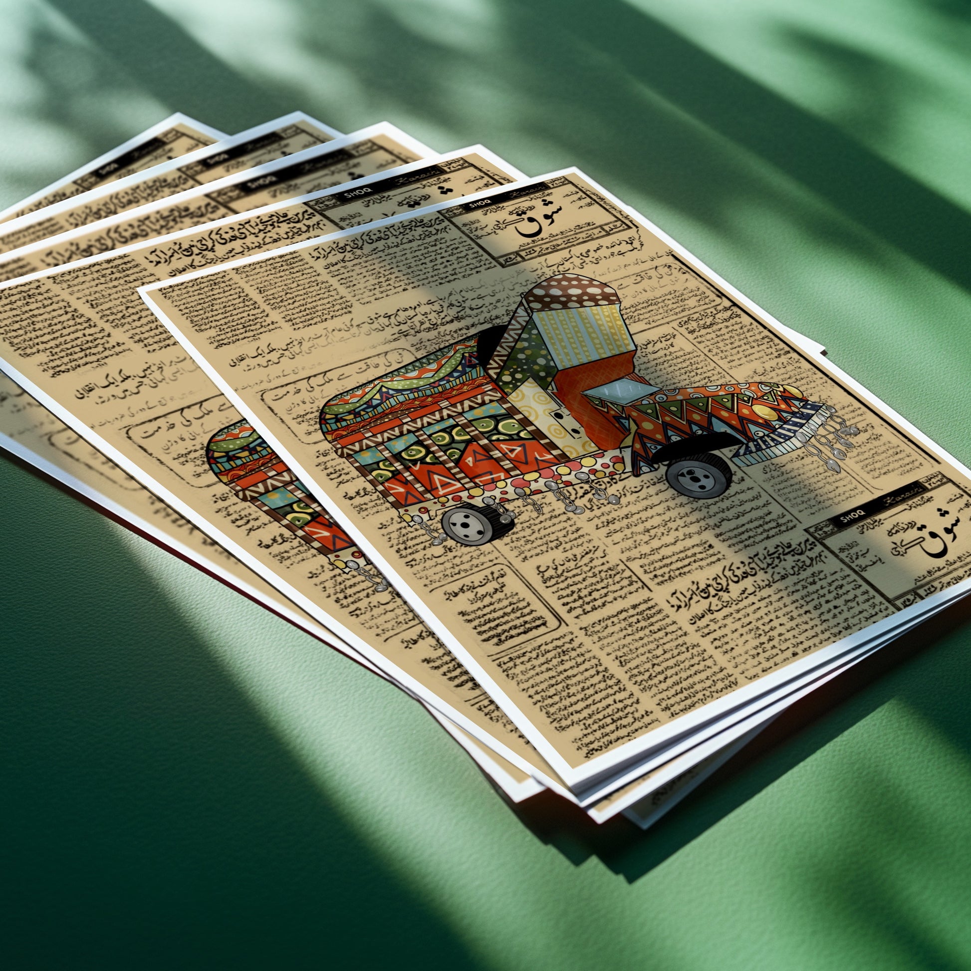 This art print features a vibrant, vintage-style truck adorned with intricate details and bright, bold colors, set against a backdrop of an Urdu newspaper. Pakistani truck art is not just a form of decoration; it’s a powerful expression of culture, identity, and pride. Truck art is a tradition that dates back decades, where drivers decorate their vehicles with bright colors, floral patterns, religious symbols, and poetic phrases, each telling a unique story of the driver’s journey, identity, and regional pride.