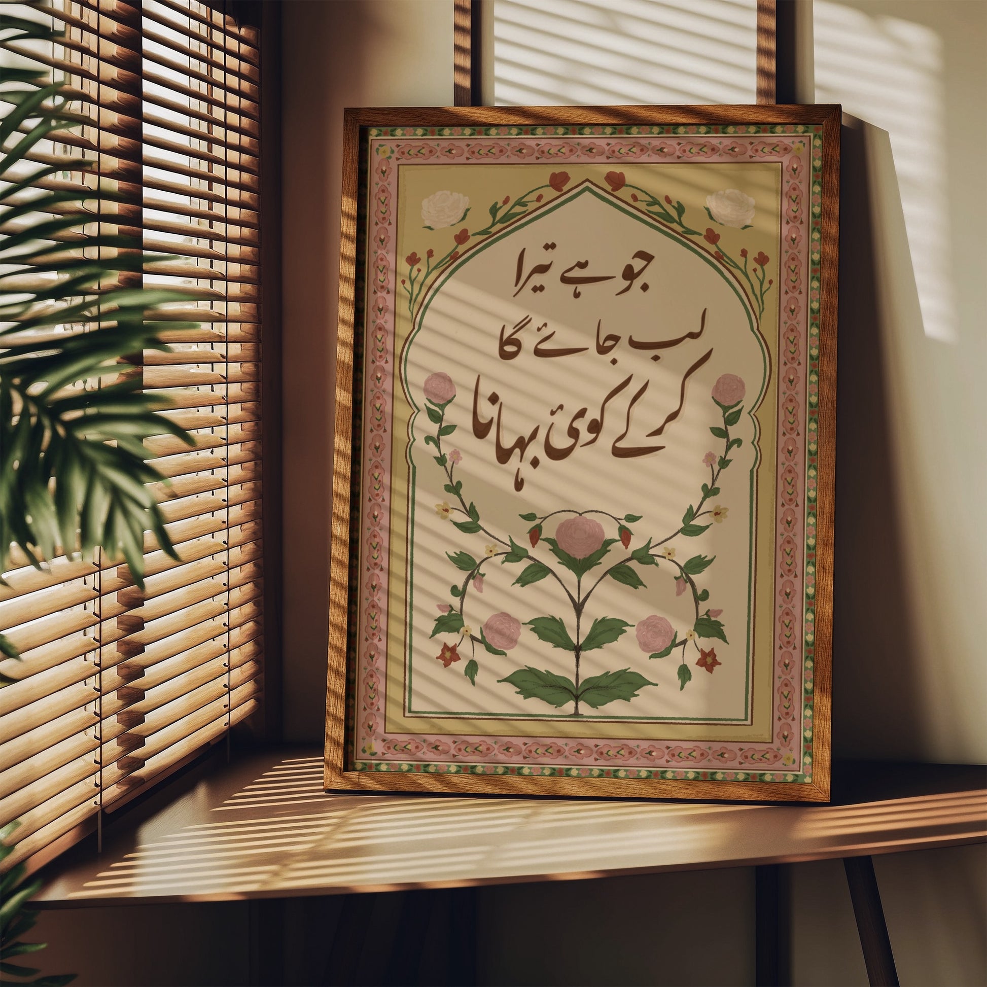 This art print draws inspiration from the beauty and intricacy of Mughal architecture, featuring a powerful line from the song "Tu Jhoom": "Jo hai tera lab jayega kar ke koi bahana," which translates to "What’s truly yours will find a way to you, no matter the excuse."