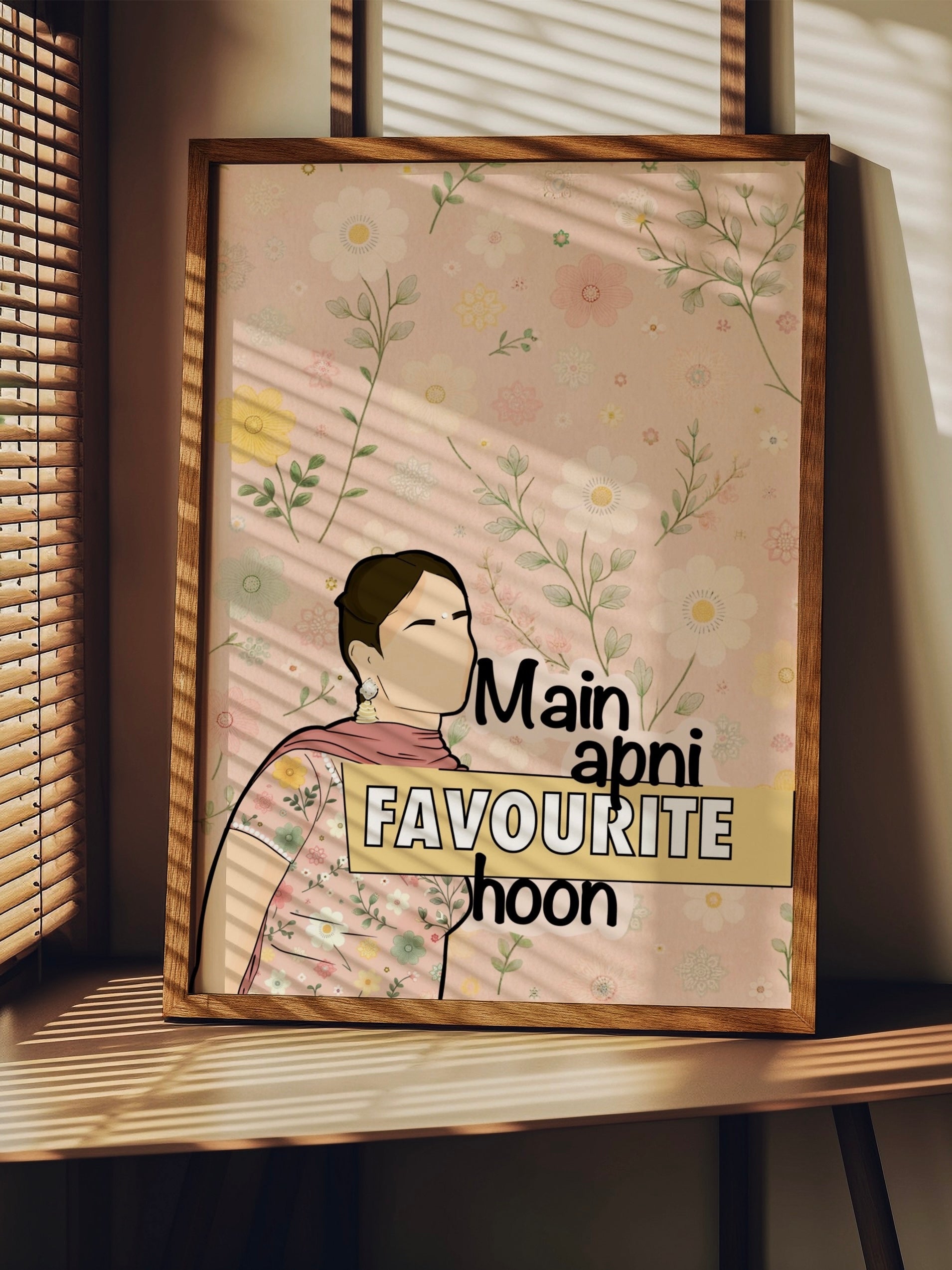 This charming art print features an illustration of Geet, the beloved character from Jab We Met, in a playful, vibrant pose, set against a soft pink floral background. Inspired by the iconic line "Main apni favourite hoon", this print captures the essence of self-love, independence, and confidence, just like Geet’s character. The soft floral background adds a feminine touch, while the warm, inviting colors bring life to the print.