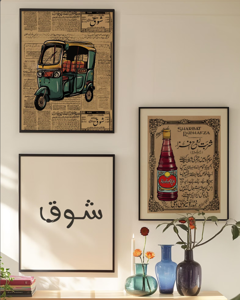 Inspired by a classic Urdu Rooh Afza advertisement, this print brings the refreshing nostalgia of one of Pakistan’s favorite drinks. The design celebrates the retro typography and vibrant colors of the ad, evoking memories of hot summer days spent enjoying this iconic beverage. It’s a perfect tribute to both Rooh Afza and vintage advertising.