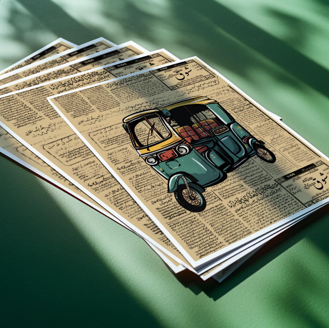 Classic Rickshaw – Vintage Art Print with Urdu Newspaper Background