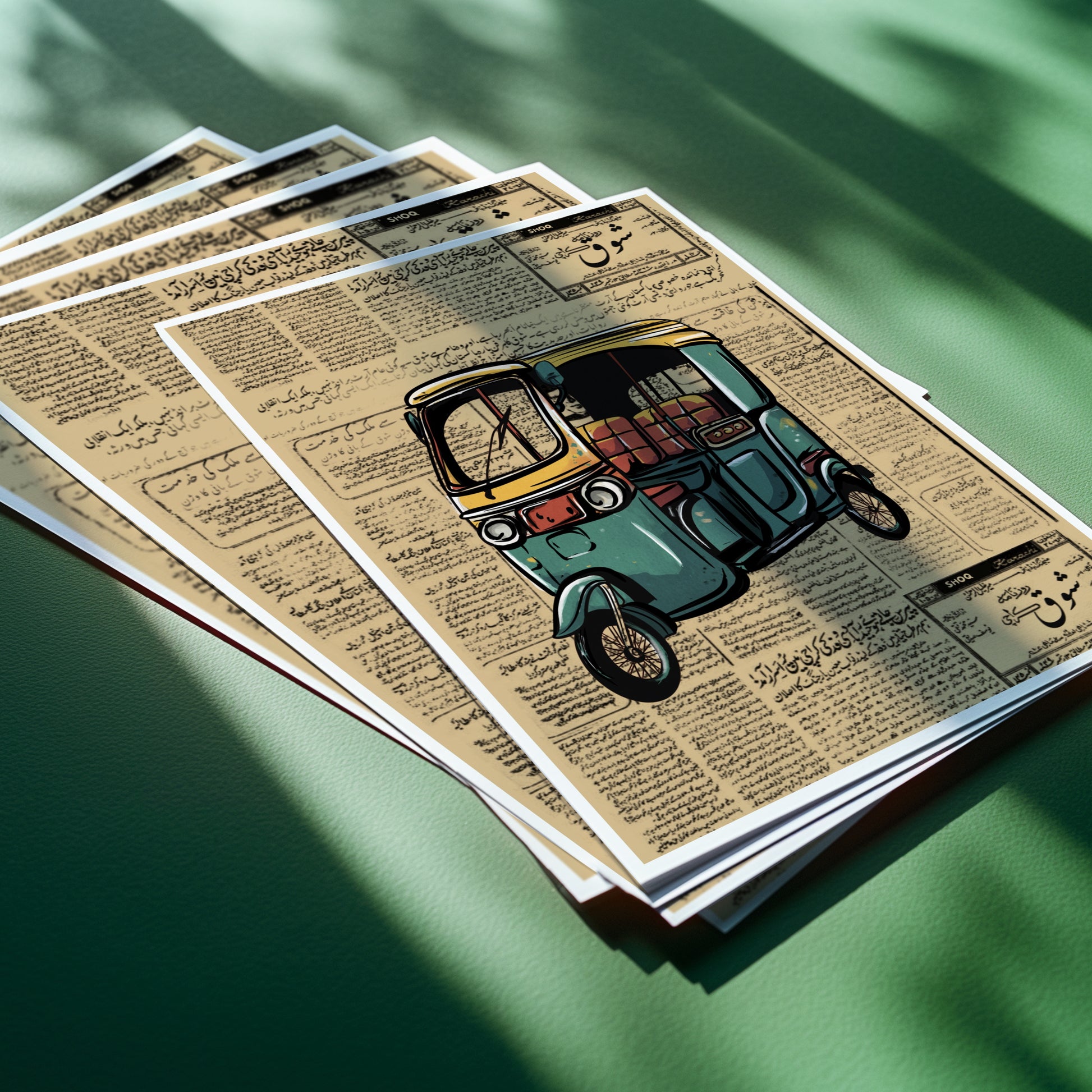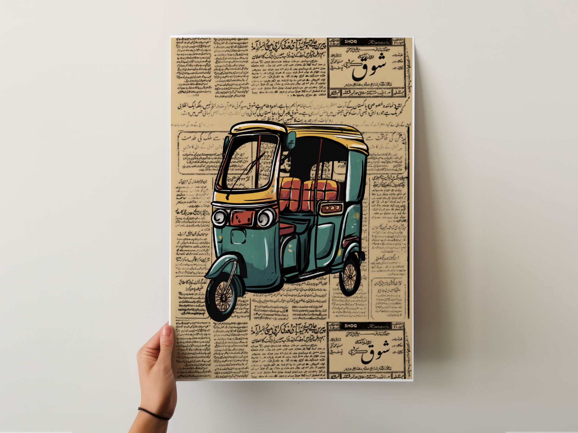 Vintage Rickshaw Art Print with Urdu Newspaper Background