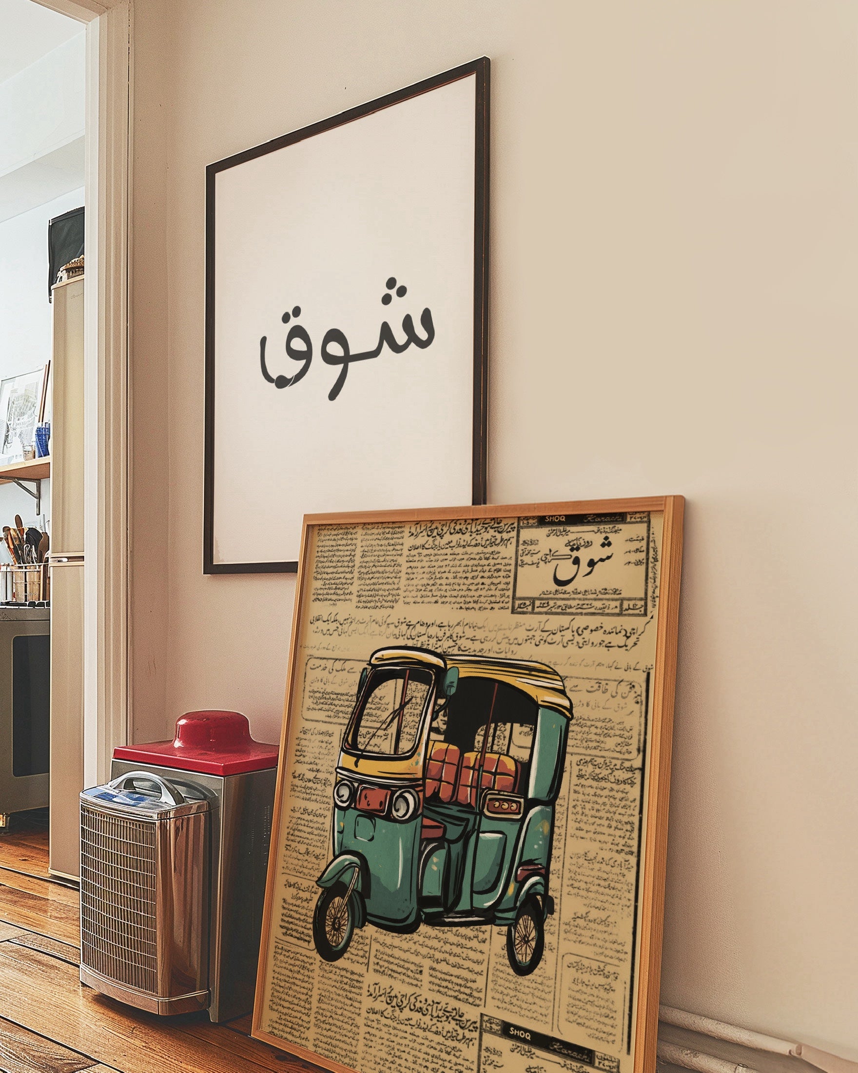 his art print is a perfect blend of Shoq’s signature style, featuring a vibrant, vintage-inspired rickshaw adorned with intricate patterns and lively colors. The backdrop of an Urdu newspaper adds depth and cultural authenticity, paying tribute to the rich heritage of Pakistan’s streets. This combination of bold, traditional elements and the familiar newspaper style embodies the soul of Shoq—capturing everyday beauty, nostalgia, and the unique pulse of Pakistani culture.