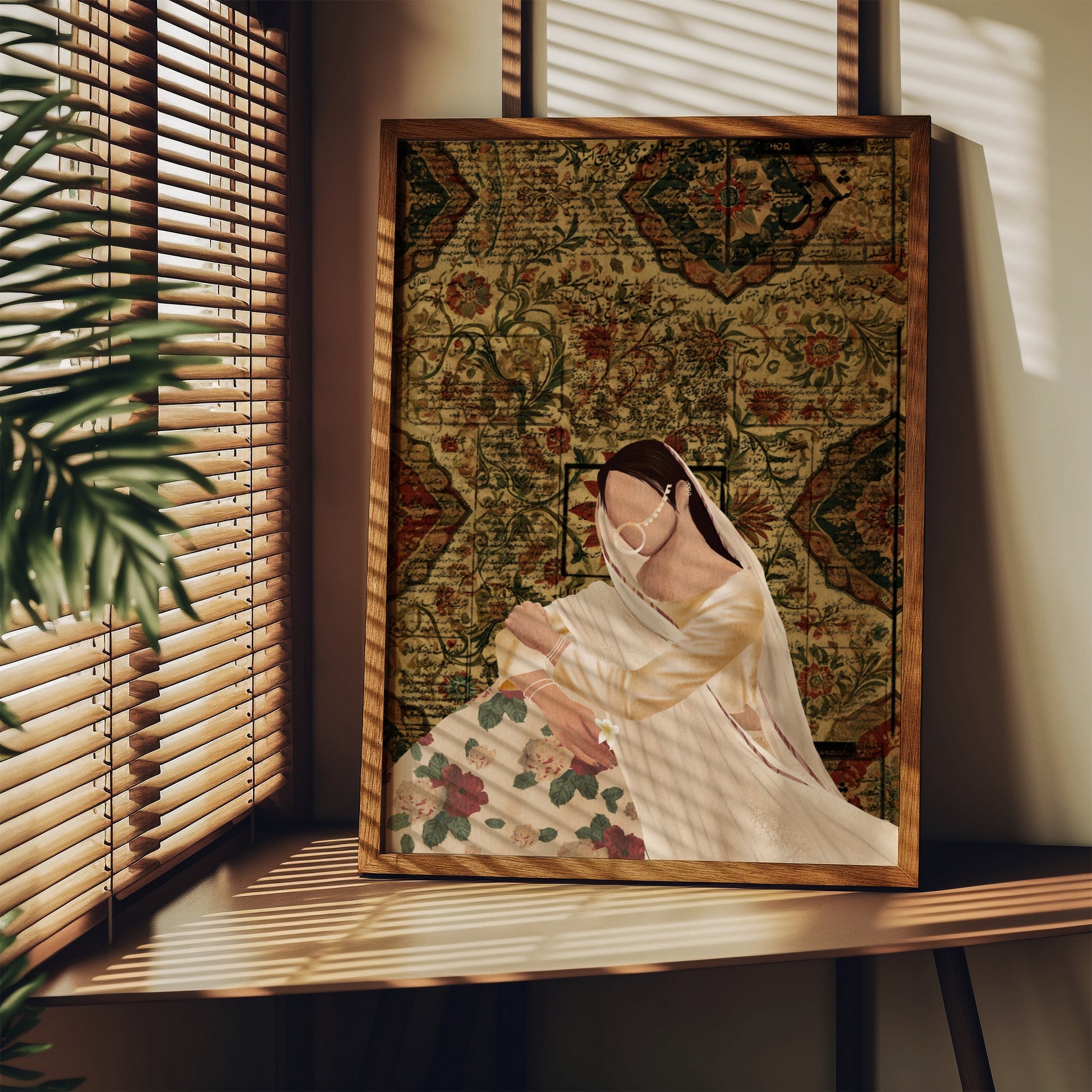 What makes this piece truly special is the versatility of its backgrounds, offering different color schemes that enhance the cultural depth of the artwork. Each background complements the subject, adding a layer of sophistication while celebrating the beauty of South Asian femininity and the spirit of heritage.