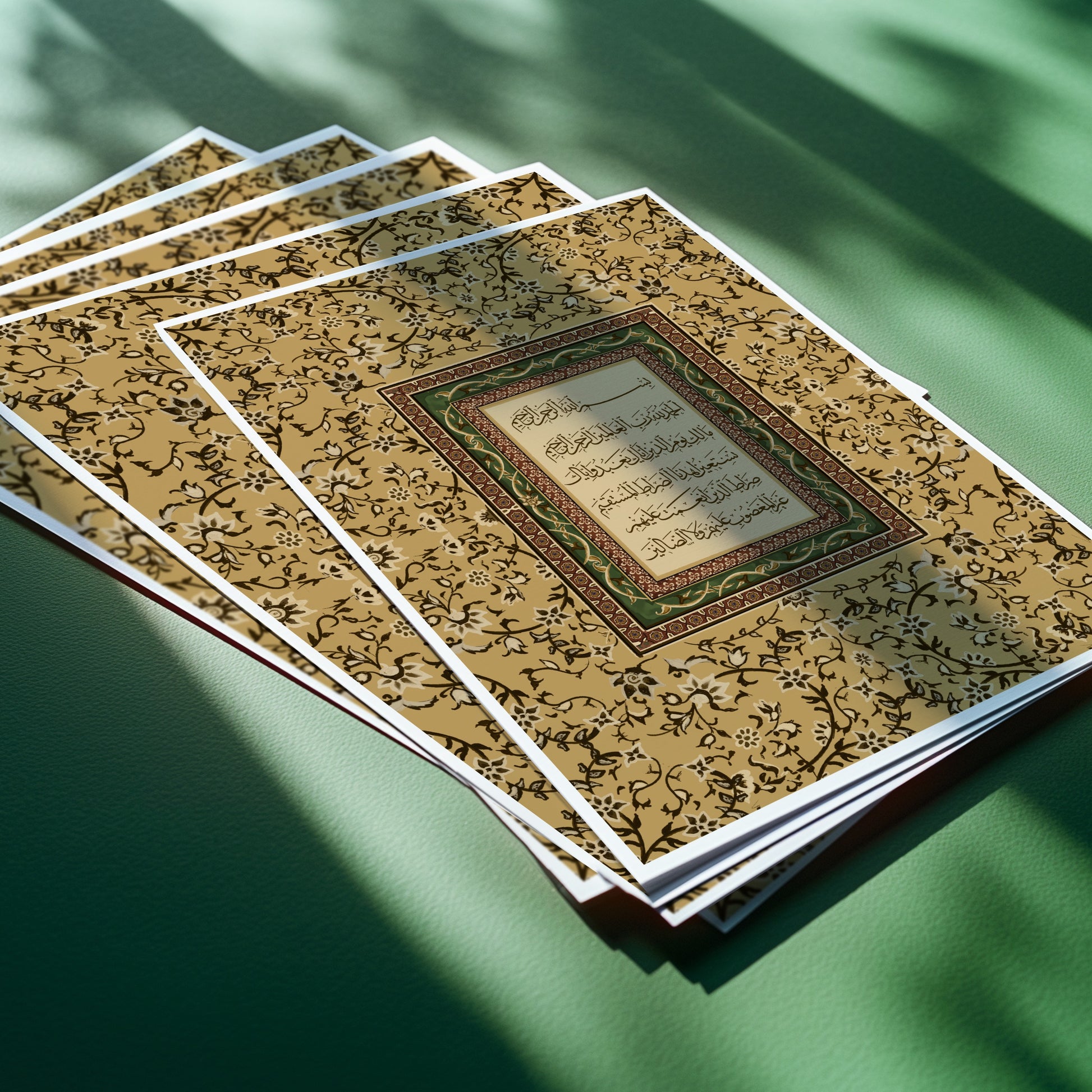 Bring a piece of Mughal-era elegance into your space with this intricately designed Quran art print. Inspired by the stunning motifs of Lahore’s historic Wazir Khan Mosque, this piece reimagines a traditional Quran manuscript with floral patterns and geometric borders straight out of the Mughal aesthetic. The central calligraphy features Surah Al-Fatiha, surrounded by delicate ornamental details drawn from the mosque’s timeless tile work and architecture.